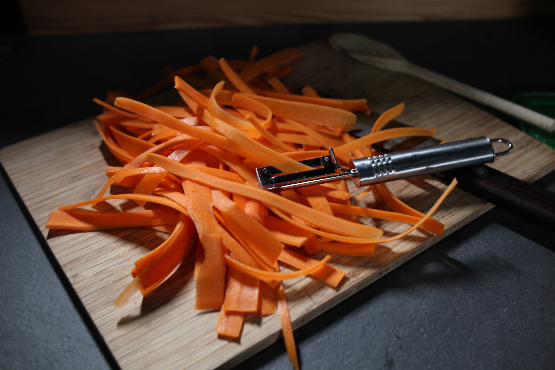 Möhren waschen, schälen und mit nem Spiralschneider in dünne Nudeln schneiden.