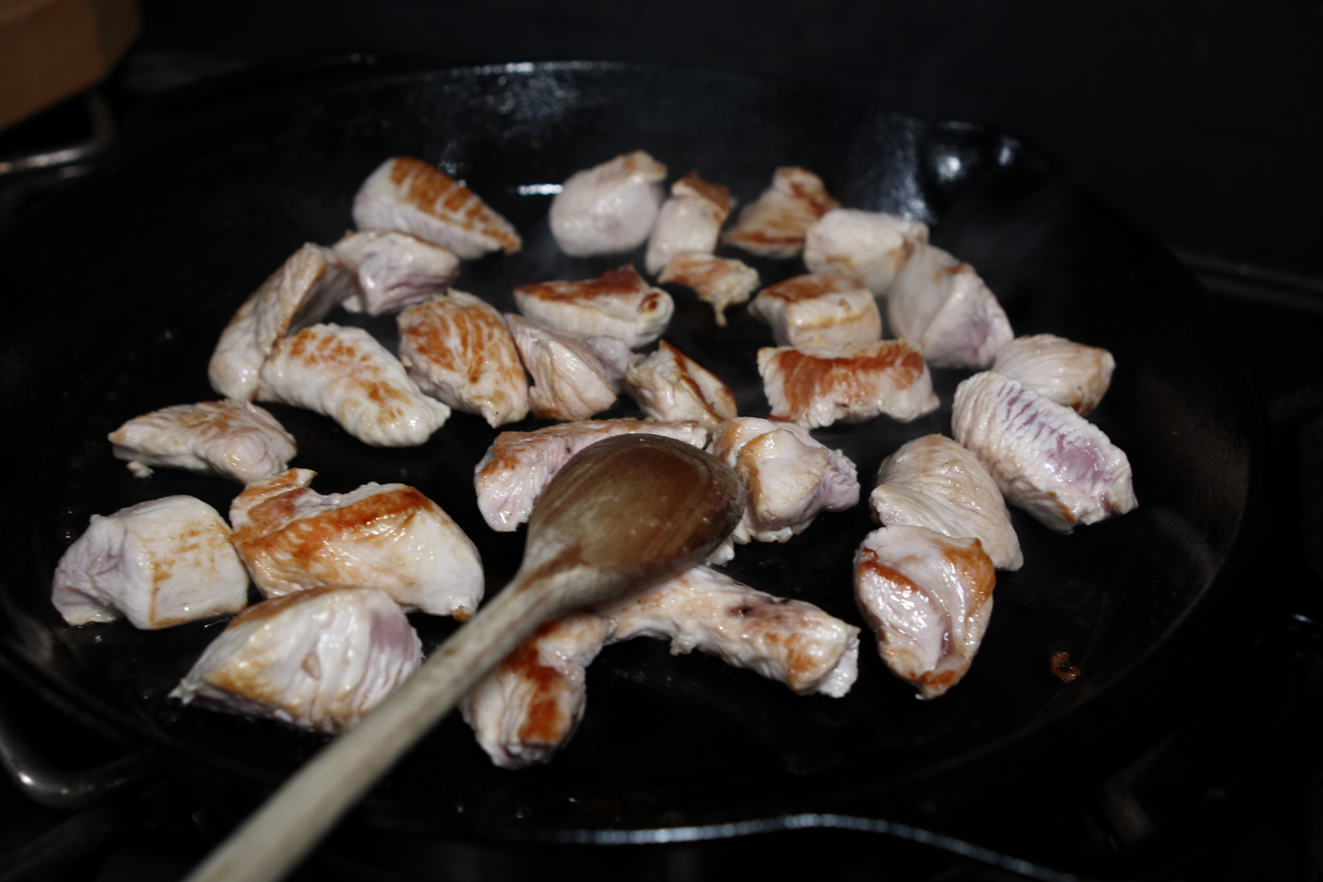 In der Pfanne etwas Öl heiß werden lassen, dann die Putenwürfel rein. 2–3 Min. auf hoher Hitze anbraten, bis sie leicht Farbe kriegen.