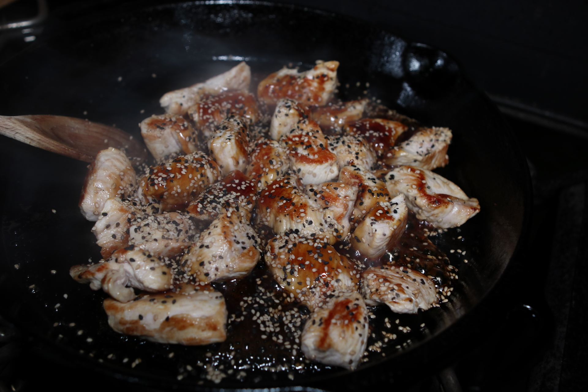 Jetzt gibst du die Teriyaki-/Sweet-Soy-Sauce dazu. Kurz mitbraten, sodass die Pute schön würzig wird und die Sesamkörner untermischen.