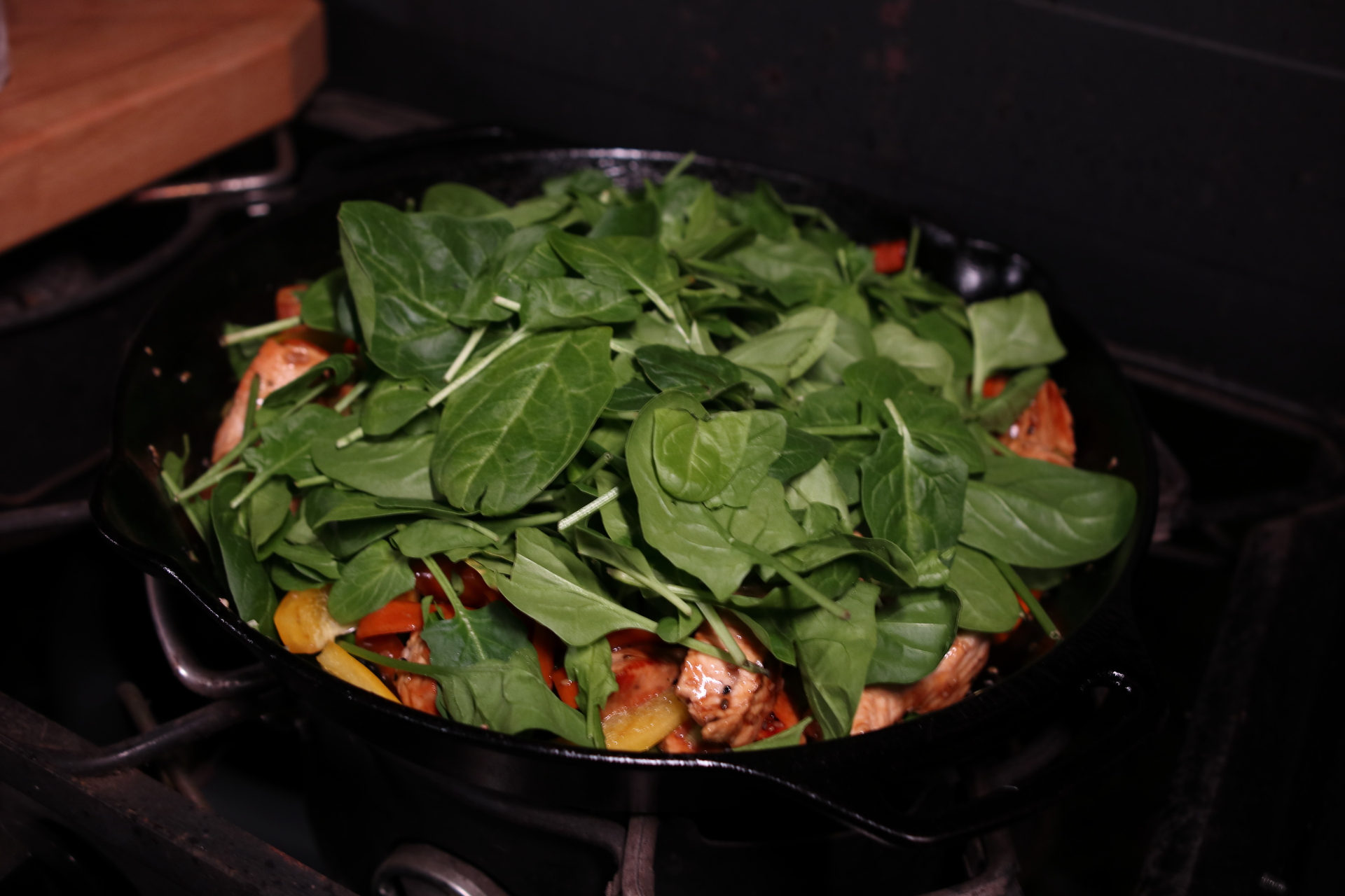 Nun kommt wieder das Fleich und der Spinat, Frühlingszwiebeln sowie die Paprika in die Pfanne. Noch 1–2 Min. alles zusammen anbraten, bis der Spinat zusammenfällt.