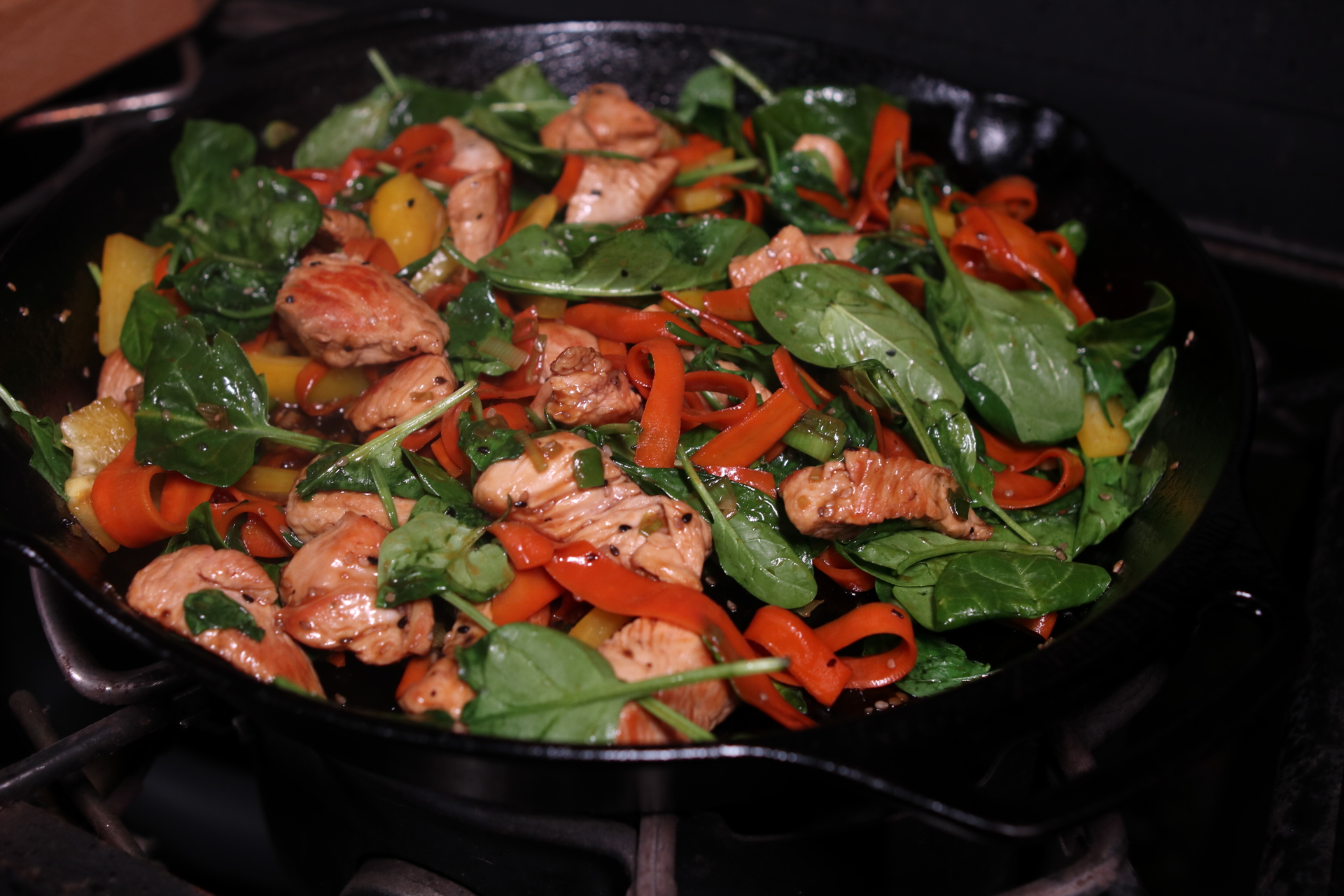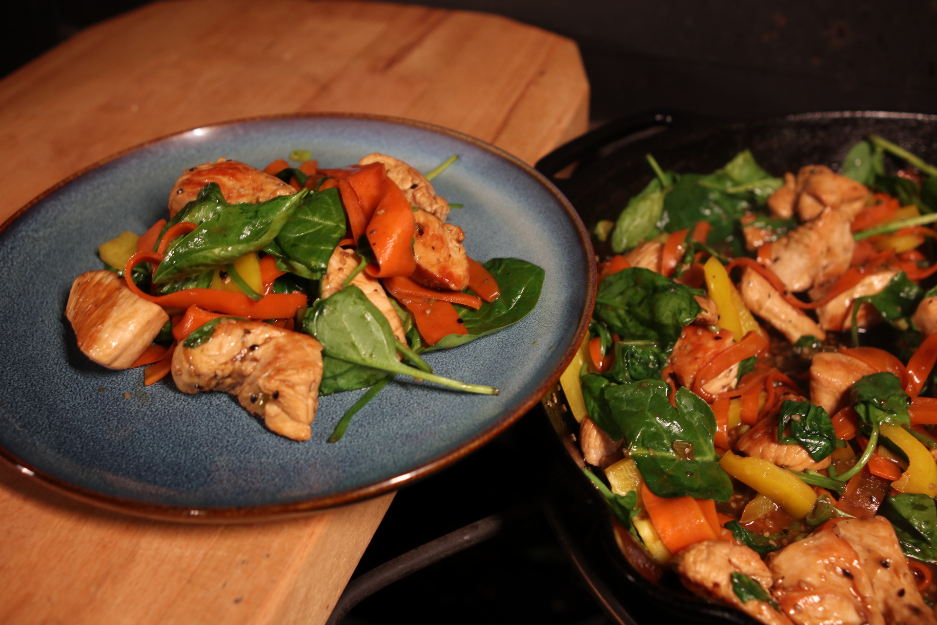Teriyakipfanne mit Möhrennudeln und Babyspinat
